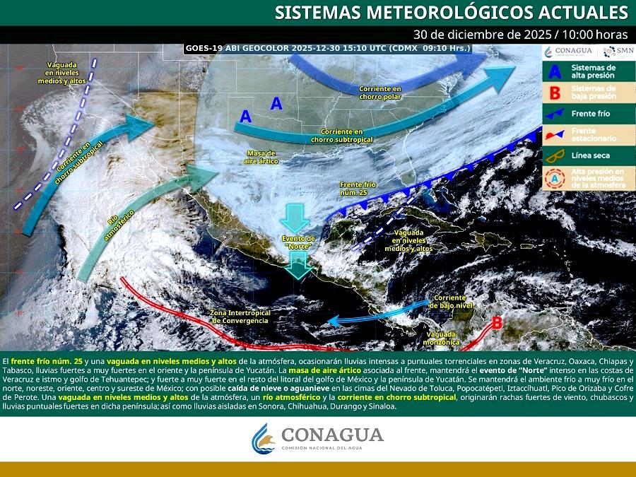 Debido a estas condiciones, indicó que se han registrado rachas de viento entre los 40 y 60 kilómetros por hora, así como el incremento de nubosidad en el sur de la península, por lo que para los próximos días se prevé la persistencia del flujo de humedad, con intervalos de chubascos y lluvias puntuales de moderadas a fuertes, acumulados estimados entre 25 y 50 milímetros, además de rachas de viento que podrían oscilar entre los 40 y 70 kilómetros por hora, principalmente entre el martes 30 de diciembre, el miércoles 31 y el jueves 1 de enero.