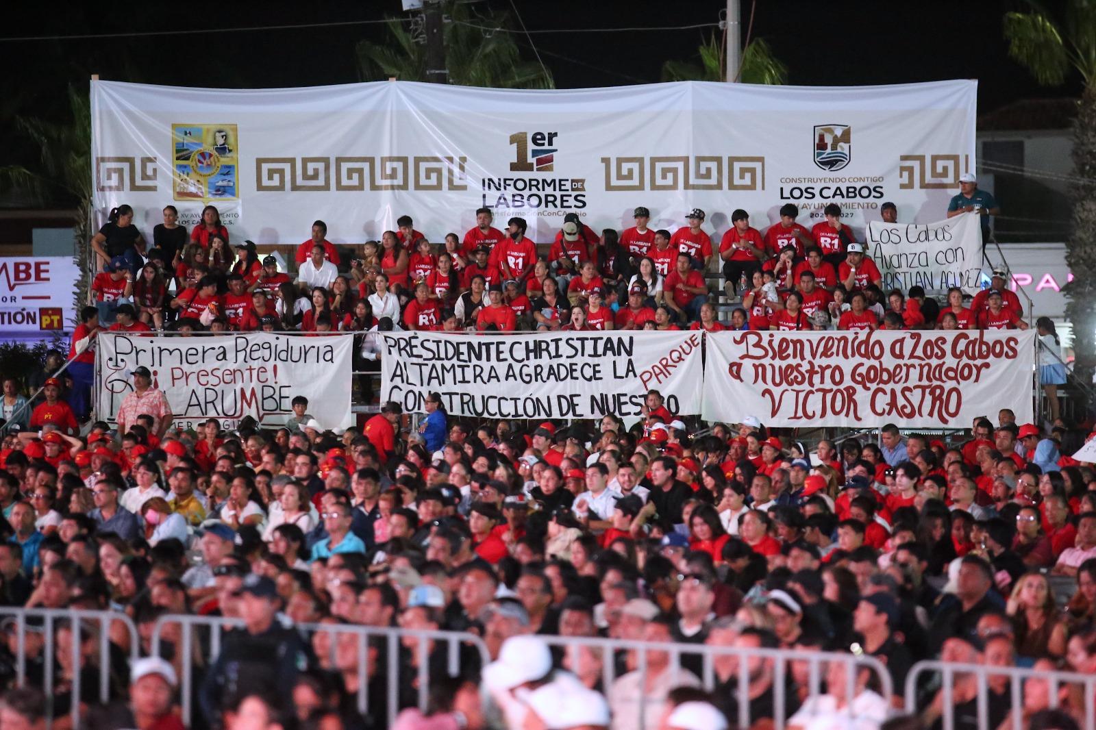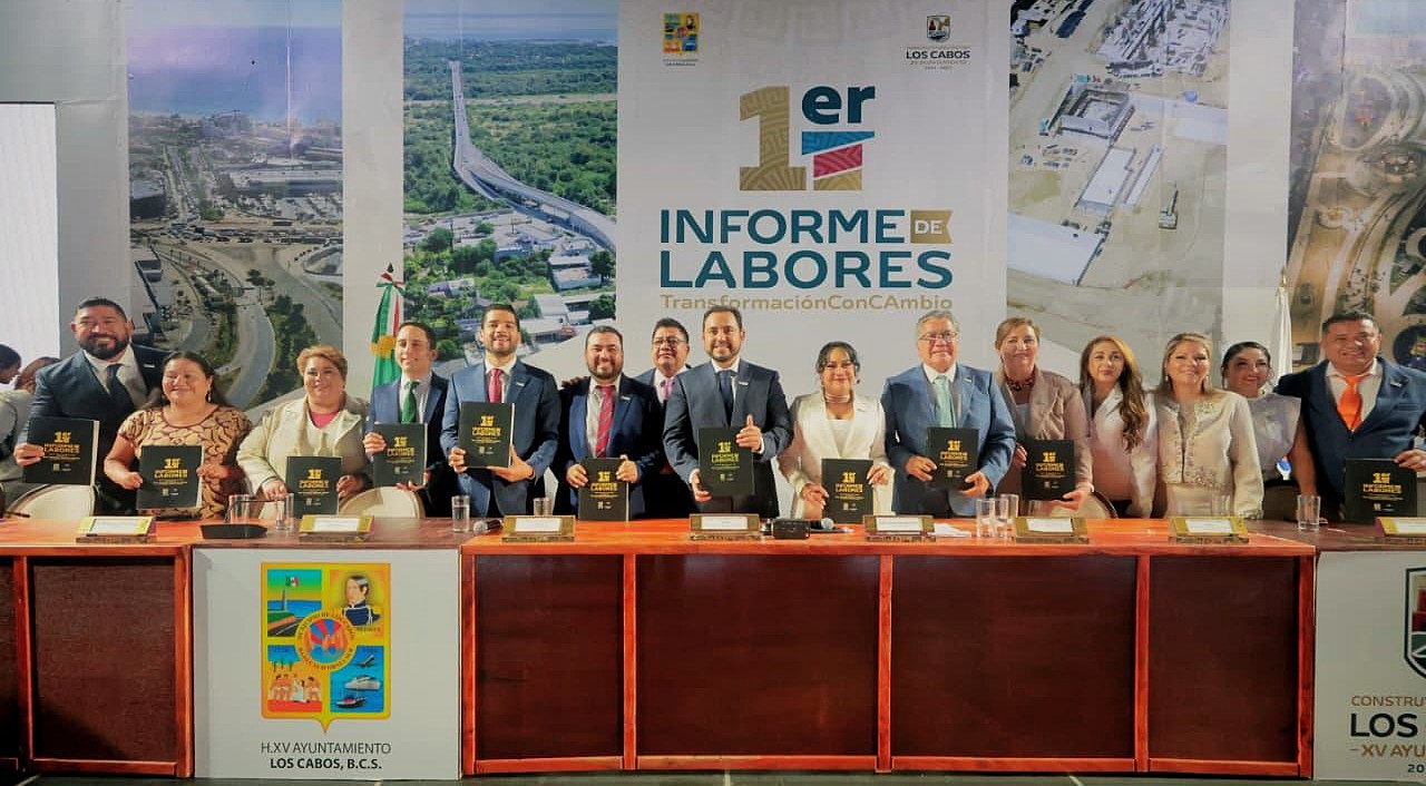 Los Cabos, Baja California Sur.– Con la convocatoria a continuar unidos en la transformación de Los Cabos el presidente municipal, Christian Agúndez Gómez destacó en su mensaje del Primer Informe de Labores la obra pública, los apoyos asistenciales y el constante respaldo de la presidenta Claudia Sheinbaum Pardo, así como el gobernador Víctor Castro Cosío además destacó los resultado en materia de obra pública, inclusión social, seguridad y la reafirmación en el ámbito turístico del destino.