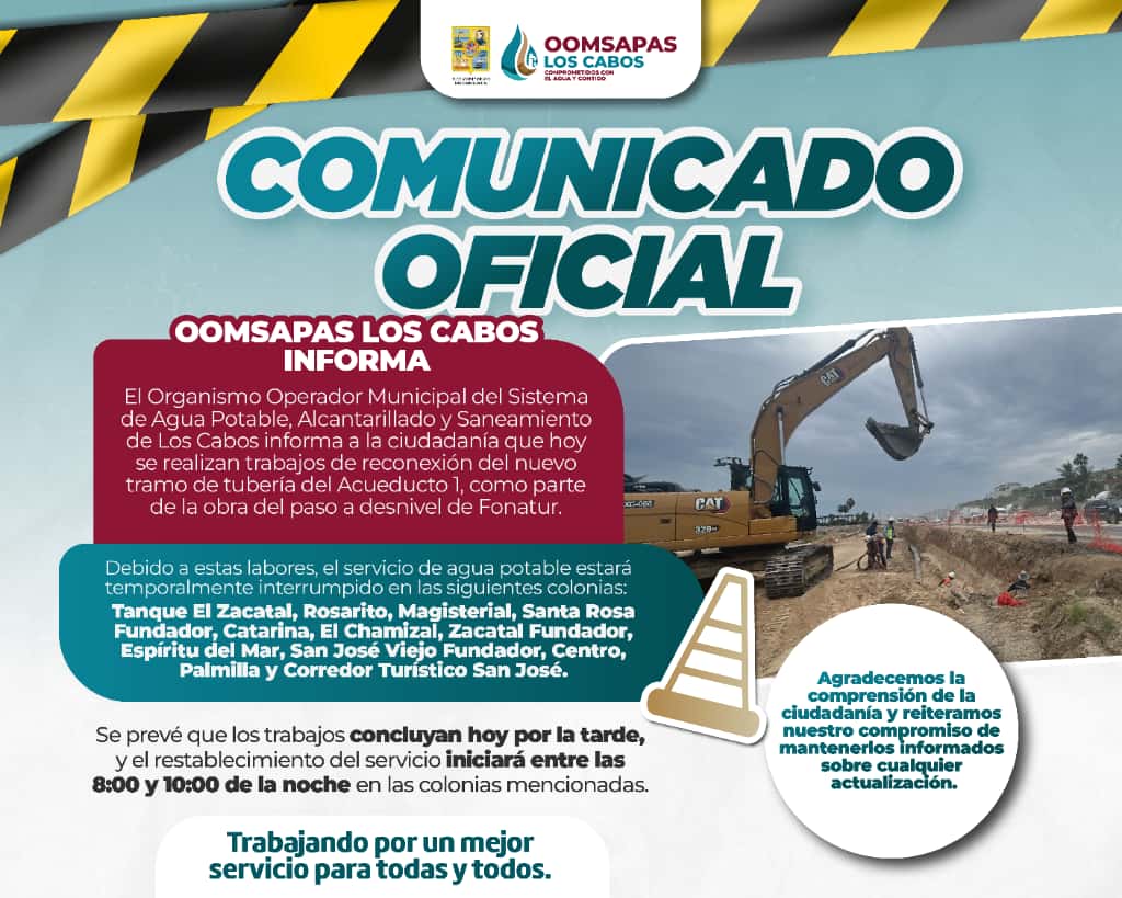 El Organismo agradece la comprensión de la ciudadanía por las molestias que estas maniobras pudieran ocasionar, reiterando su compromiso de continuar fortaleciendo la infraestructura hidráulica de Los Cabos para ofrecer un servicio más eficiente y de calidad.