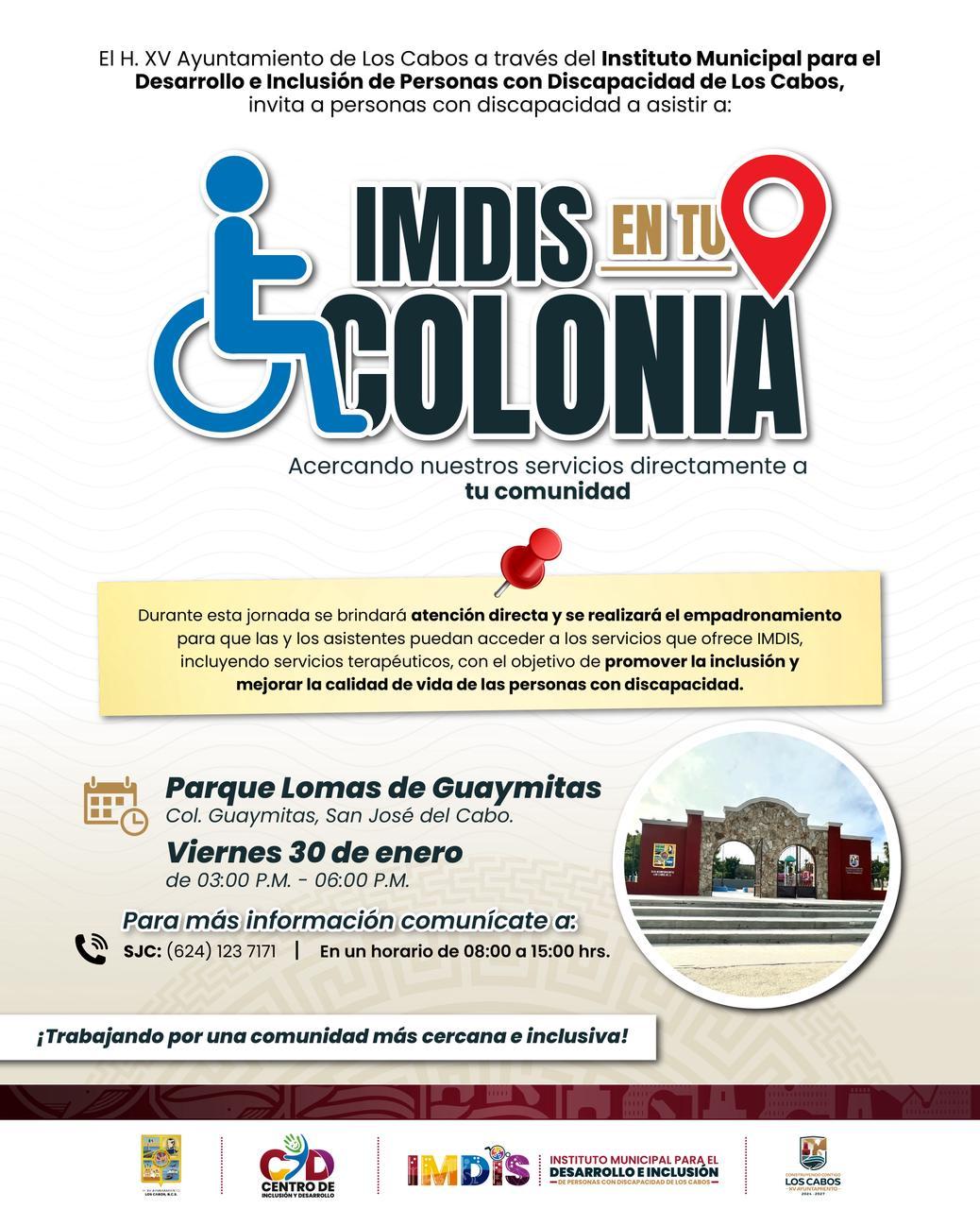 Los Cabos, Baja California Sur.– Con la puesta en marcha del programa IMDIS en tu Colonia, el Gobierno de Los Cabos a través del Instituto Municipal para el Desarrollo e Inclusión de Personas con Discapacidad (IMDIS), acerca servicios de salud, terapias, talleres e integración entre la comunidad con discapacidad motriz y la autoridad municipal.
