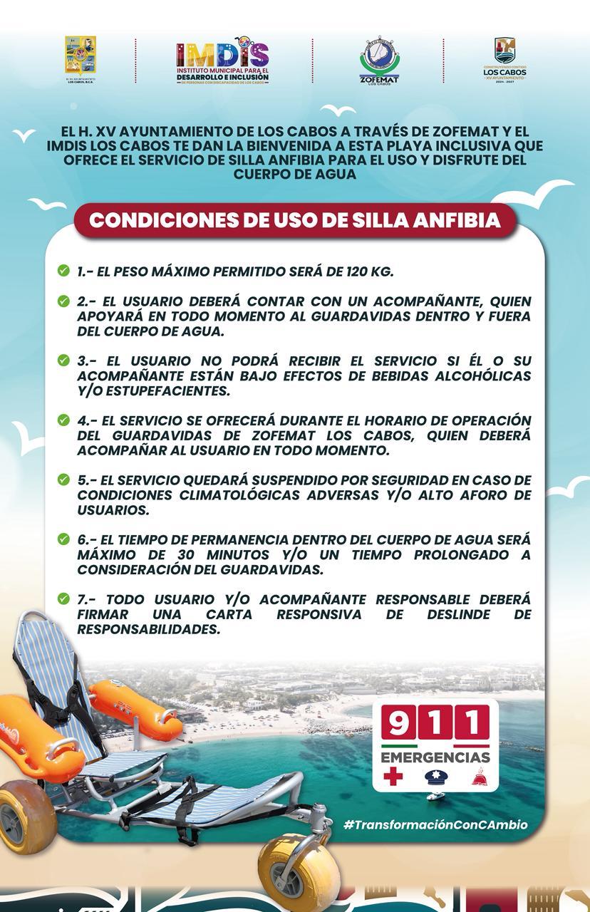 Los Cabos, Baja California Sur.– Con el objetivo de garantizar el acceso a las playas para todas las personas, el XV Ayuntamiento de Los Cabos que preside Christian Agúndez Gómez, implementó protocolos de atención y uso de sillas anfibias, en coordinación con el Instituto Municipal para el Desarrollo e Inclusión de Personas con Discapacidad (IMDIS) y la Zona Federal Marítimo Terrestre (Zofemat) a cargo de Rafael Guillermo Álvarez Munguía.