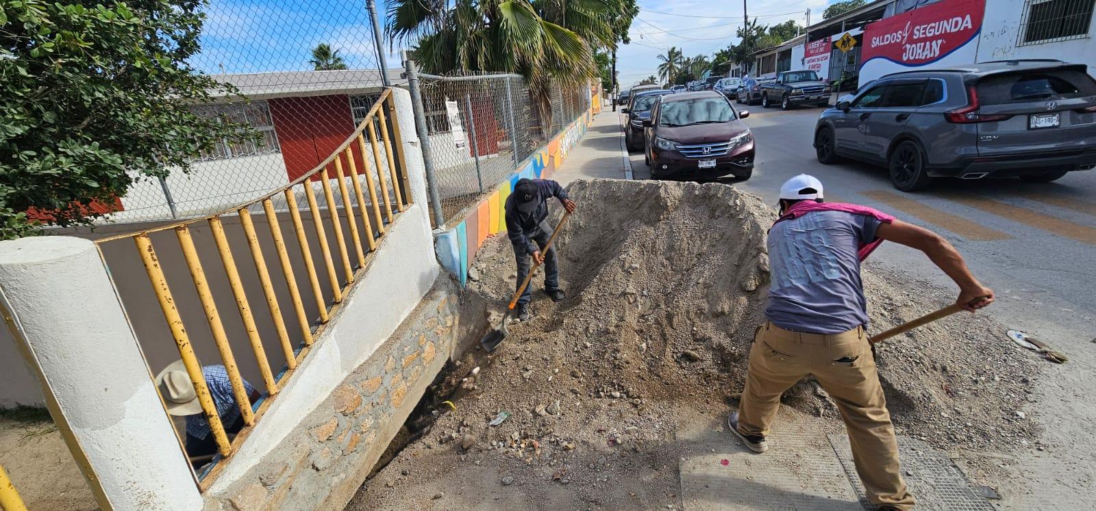 En el caso del Jardín de Niños Pericúes, informó que, tras las lluvias recientes, se registró un socavón, por lo que se realizaron trabajos de relleno con material adecuado y actualmente se labora en la rehabilitación de la banqueta dañada, con el objetivo de garantizar mayor seguridad para niñas, niños y personal educativo.
