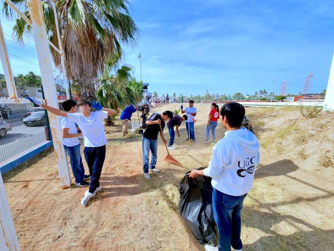 Los Cabos, Baja California Sur.- El Instituto del Deporte del Municipio de Los Cabos (INDEM), a través de su Coordinación Delegacional en Cabo San Lucas, en conjunto con la Universidad del Golfo de California (UGC) nivel preparatoria, llevó a cabo una jornada de limpieza en el estadio de fútbol de la unidad deportiva Leonardo Gastélum Villalobos. En esta actividad participaron más de 60 personas entre estudiantes, madres y padres de familia, así como personal docente.
