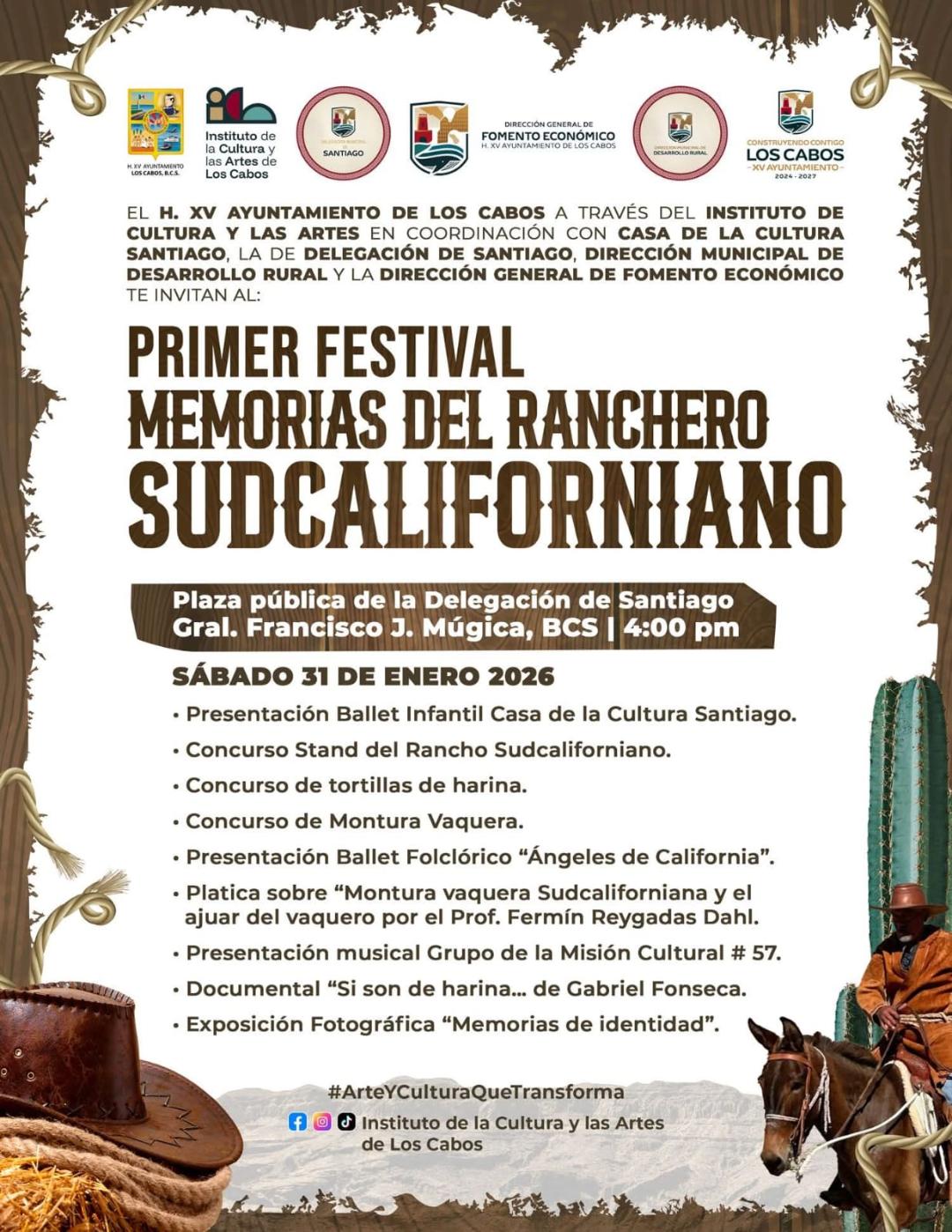 Los Cabos, Baja California Sur.– El XV Ayuntamiento de Los Cabos, a través del Instituto de la Cultura y las Artes (ICA), en coordinación con la Delegación de Santiago, la Dirección General de Fomento Económico y la Dirección Municipal de Desarrollo Rural, llevará a cabo este sábado 31 de enero el primer festival “Memorias del Ranchero Sudcaliforniano”.