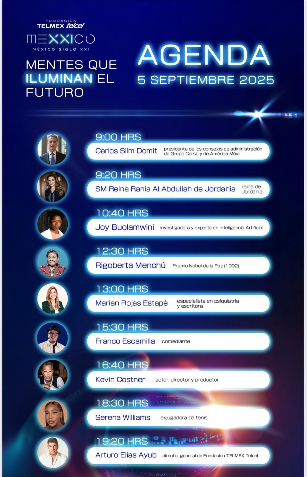 Entre ellos, Rania Al Abdullah, reina de Jordania, Joy Boulamwina, investigadora y experta en Inteligencia Artificial, Rigoberta Menchú, premio Nobel de la Paz en 1992, Marian Rojas Estape, especialista en Psiquiatria y escritora, Franco Escamilla, comediante, Kevin Costener, actor, director y productor, Serena Williams, ex jugadora de tenis.