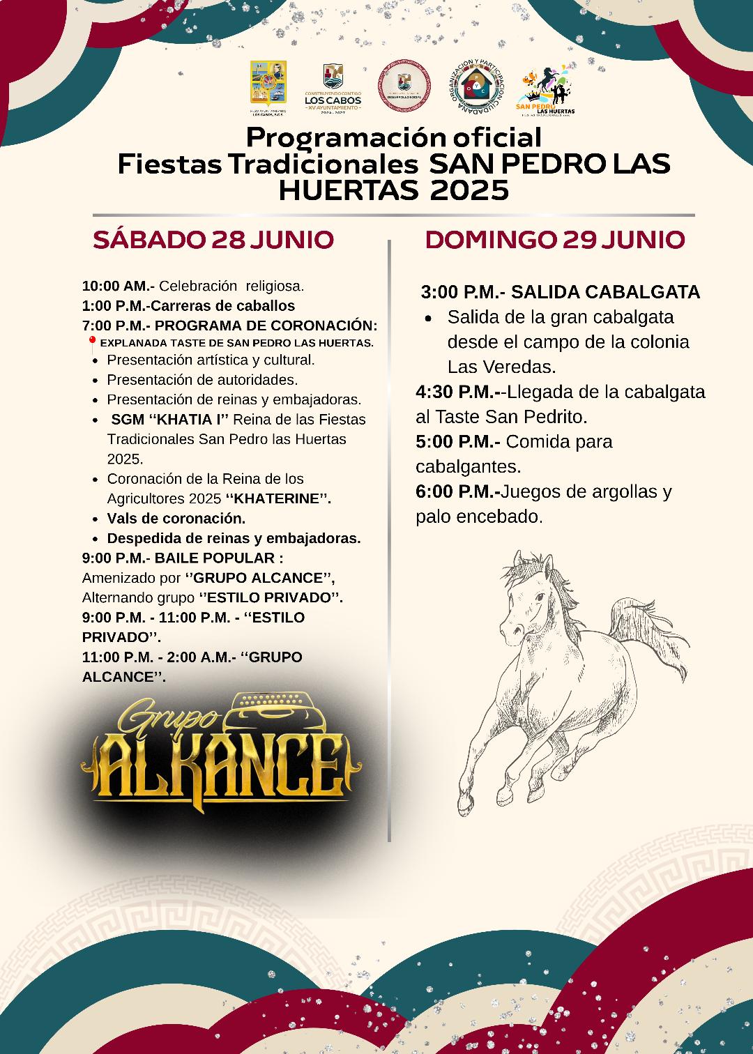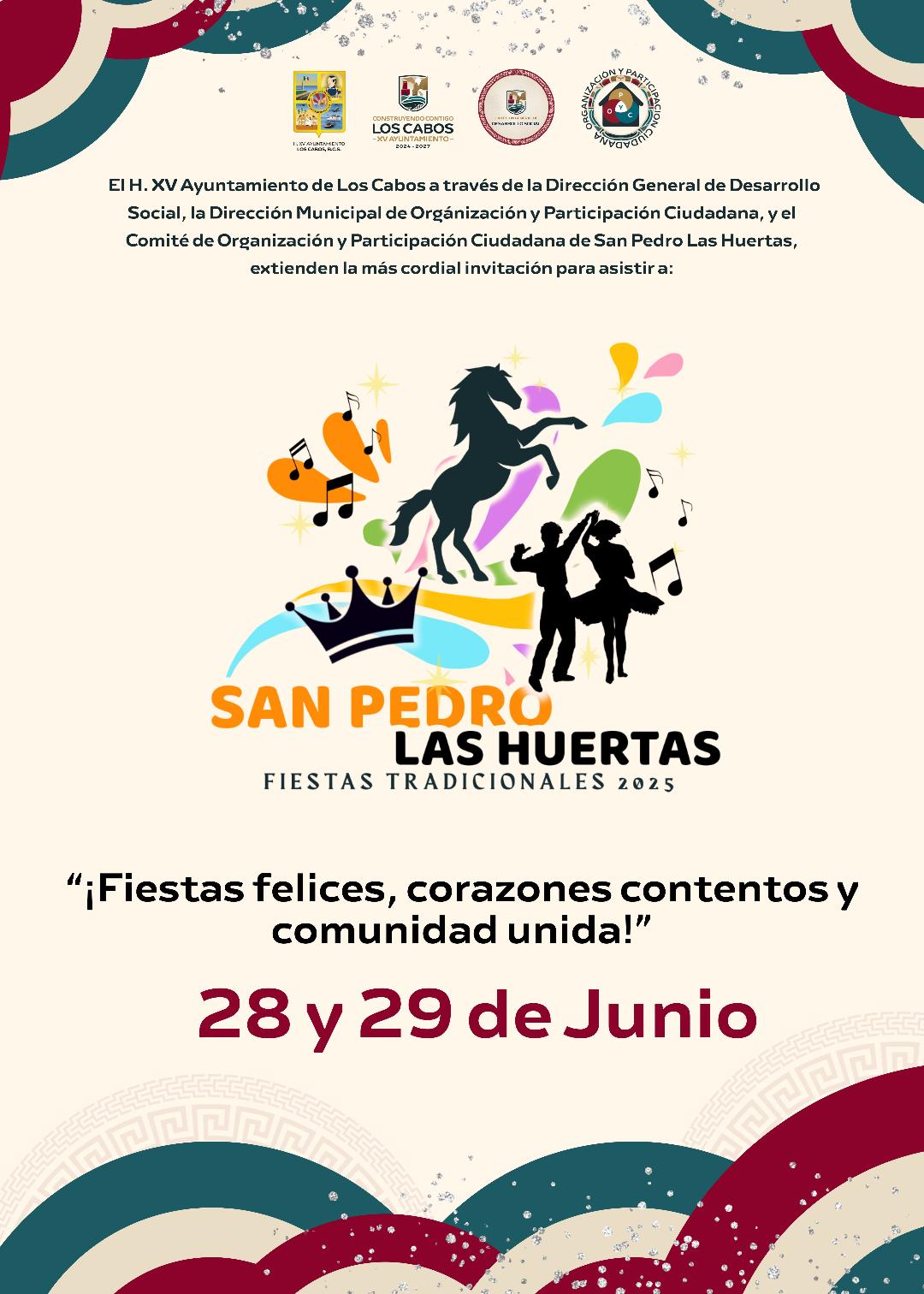 Los Cabos, Baja California Sur.- Los días 28 y 29 de junio, la comunidad de San Pedro Las Huertas llevará a cabo sus Fiestas Tradicionales 2025, una celebración que honra las costumbres, la identidad cultural y promueve la participación ciudadana.