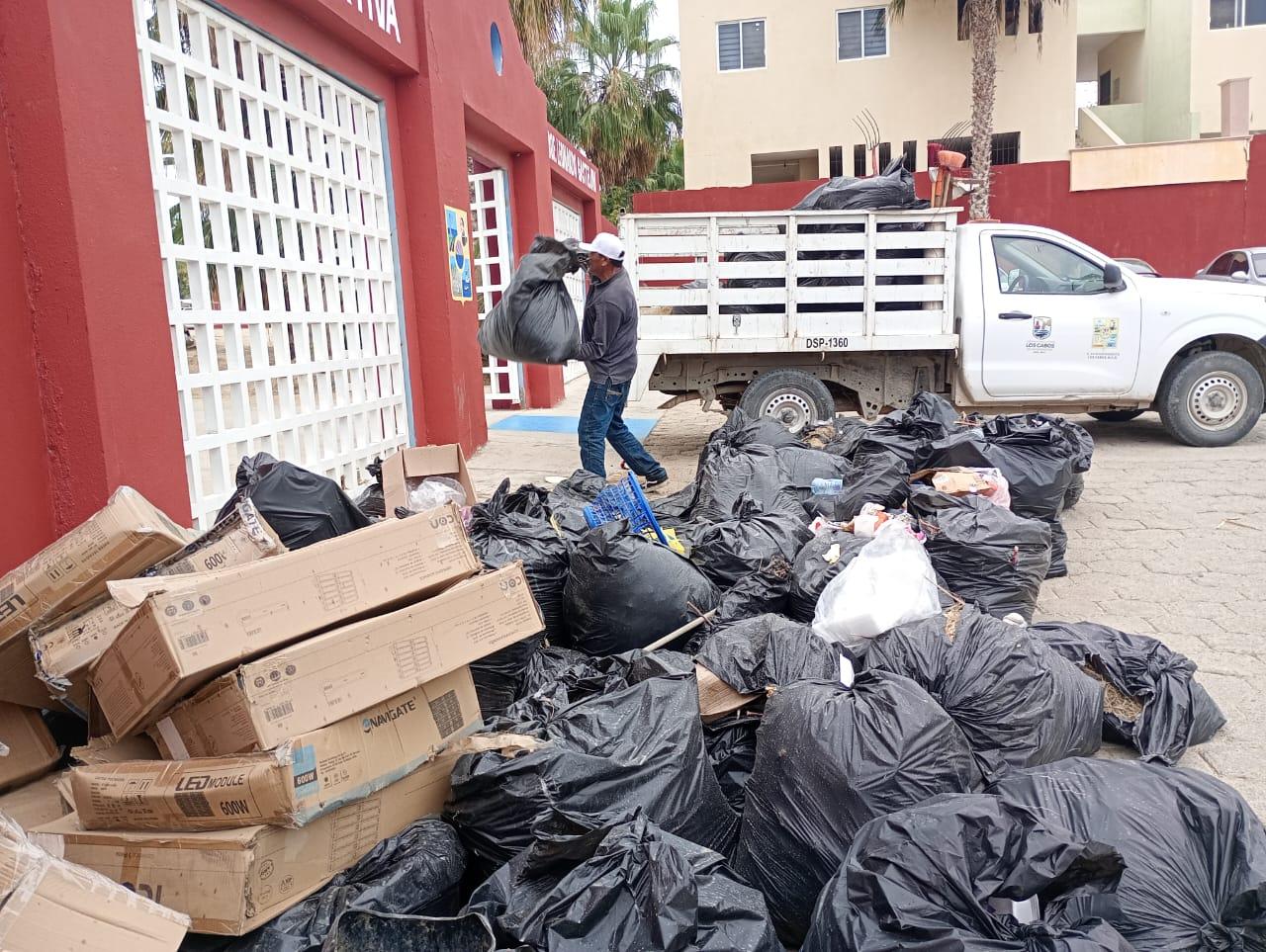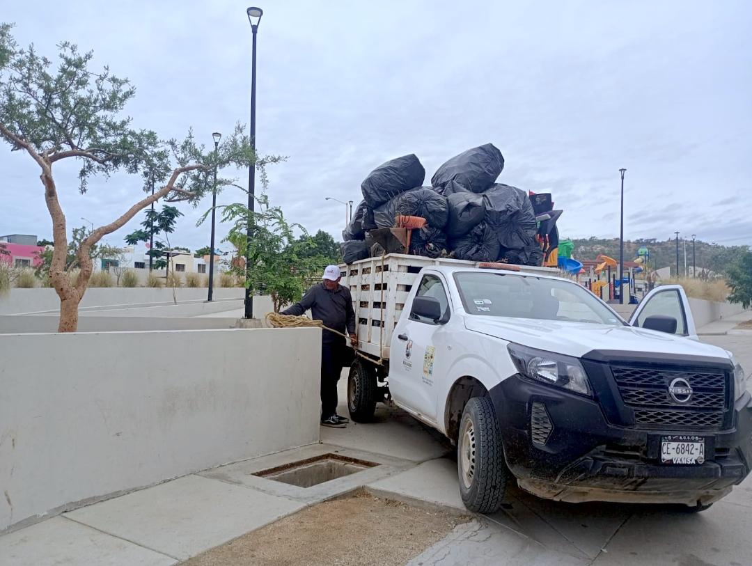 Los Cabos, Baja California Sur.- Como parte de los trabajos permanentes orientados a mantener en óptimas condiciones los espacios públicos de Cabo San Lucas, la Coordinación de Servicios Públicos realizó una jornada intensiva de recolección de basura y ramas en distintos parques y unidades deportivas de la delegación, logrando retirar tres camiones de desechos acumulados.