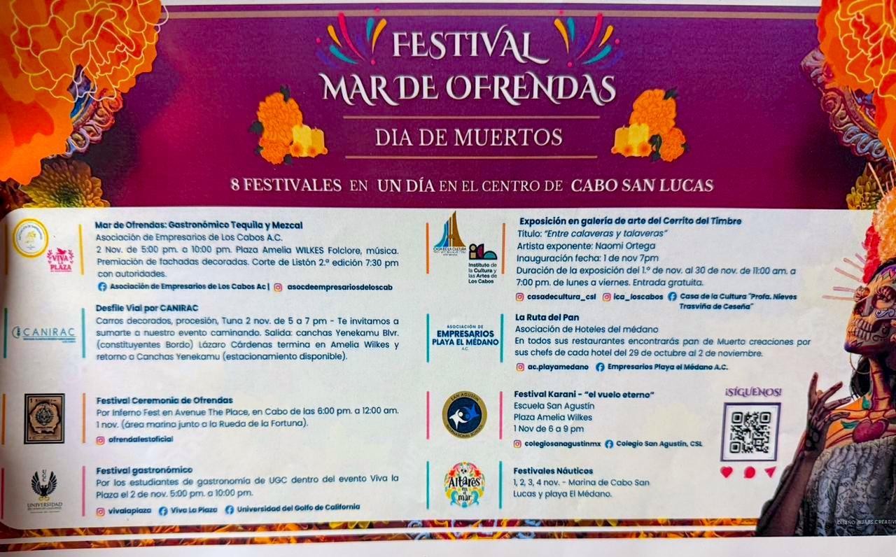 El Festival “Mar de Ofrendas: Gastronómico, Tequila y Mezcal”, organizado por la Asociación de Empresarios de Los Cabos A.C., se llevará a cabo en la plaza pública Amelia Wilkes Ceseña, el 02 de noviembre de 05:00 de la tarde a 10:00 de la noche, ofreciendo una experiencia que combina folclore, música, arte y gastronomía en honor a las tradiciones mexicanas.