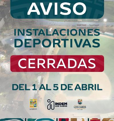 Los Cabos, Baja California Sur.– El XV Ayuntamiento de Los Cabos, a través del Instituto del Deporte del Municipio de Los Cabos (INDEM), informó la suspensión temporal de actividades en todas las unidades deportivas del municipio con motivo del periodo de Semana Santa.